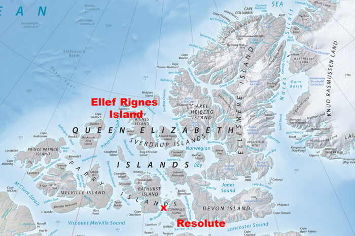 Map showing Resolute and Ellef Ringnes Island, with Chandi’s current location marked with an X. Map source: shadedrelief.com