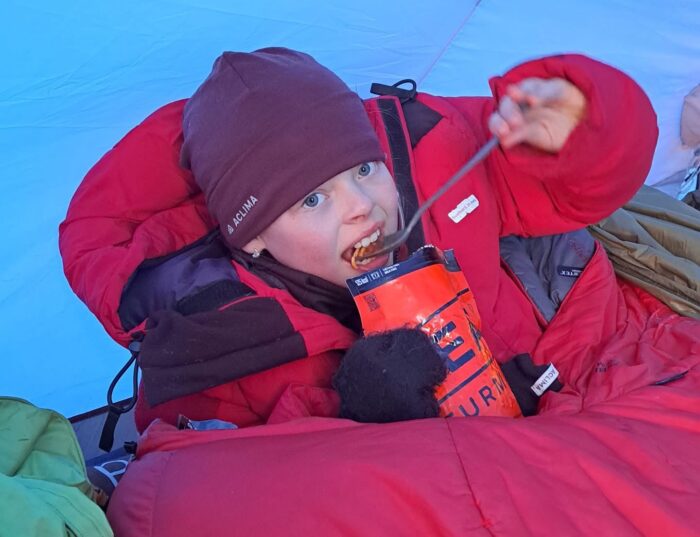 Ten-year-old Mina Read tucks into an expedition meal. Photo: Mina og meg