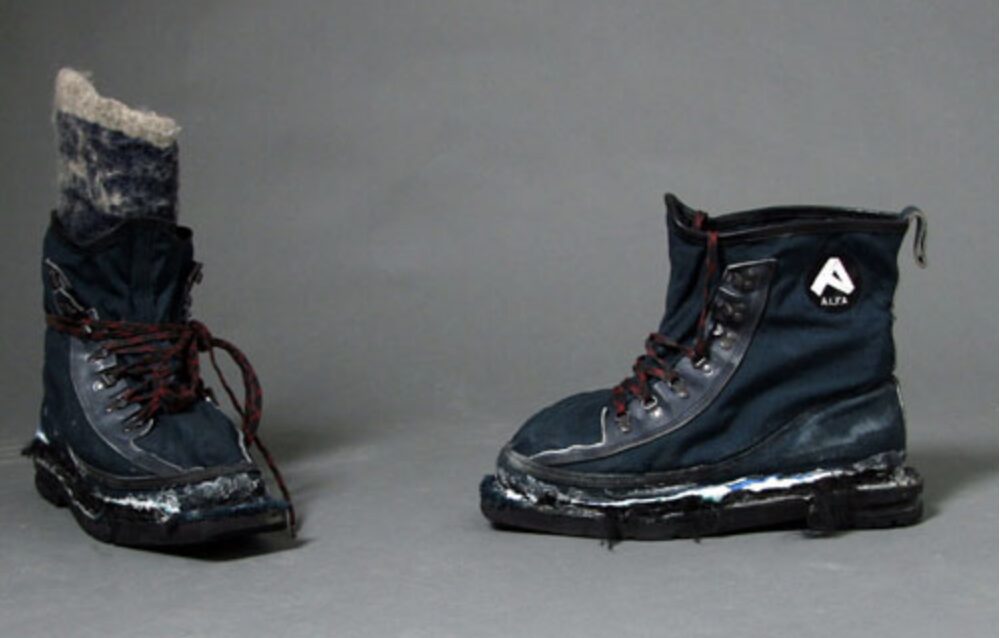 Used around camp. The common bootie used in alpine huts or mild winter camping is not warm enough for -40, so Ousland uses an old, thicker pair he picked up in Poland. The most promising modern commercial model we’ve seen is the Expedition Booties from Western Mountaineering, perhaps bought extra large and shored up with their Flash Down Booties as an inner liner for the most extreme conditions. |