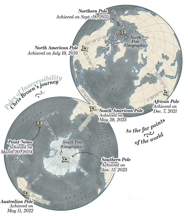 That last one stayed with him. From that moment, a different objective began to take shape — not the highest points on Earth, but the most remote ones. Brown set out to reach all Poles of Inaccessibility across the planet, a little-known collection of the places farthest from water or land.