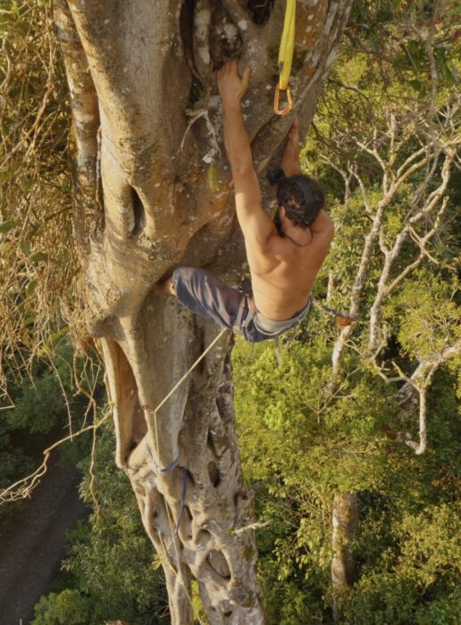 Some of the trees even go beyond vertical and overhang significantly, thanks to the unique way in which Strangler figs wrap around their hosts. Kane doesn’t tend to grade the climbs in traditional rock climbing standards, but has a sense of how they compare to grades on rock.