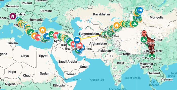 Theirs is not a continuous route: They took a train to Korea, flew over prickly Turkmenistan, and caught the ferry from Greece to Turkey, among other shortcuts. On the other hand, they have cycled through some politically sensitive countries, including Iraq, Iran, and Tajikistan. Some of the most interesting terrain has been the high roads that run across Tibet.