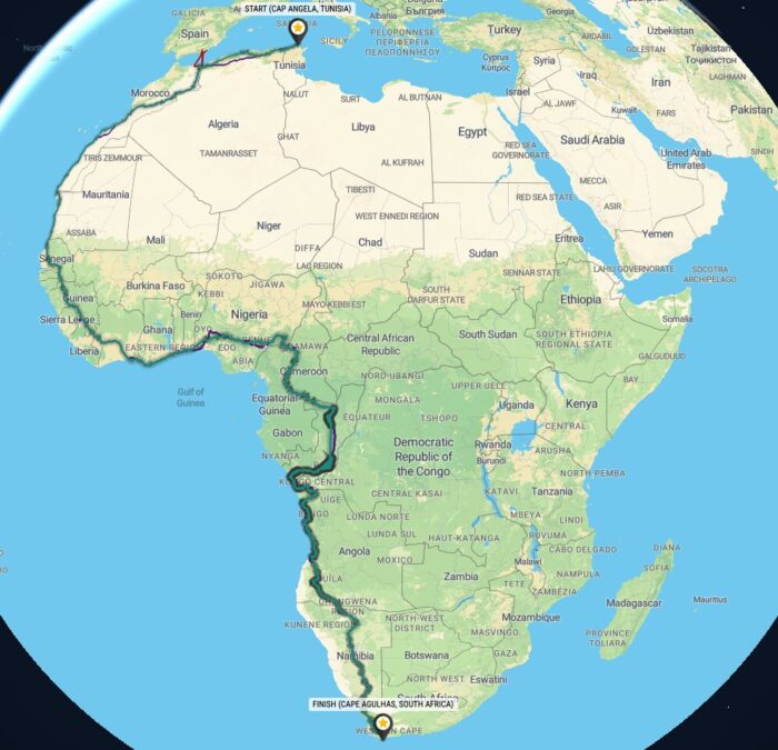 He started out at Cape Angela in Tunisia, Africa’s northernmost point, on January 3. ExplorersWeb last updated on Liechti’s progress when he had reached the Republic of Congo, after two weeks in military detention in Cameroon.