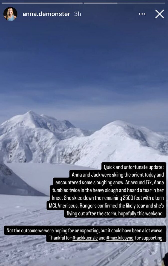 Unfortunately, while skiing with partner Jack Kuenzle at around 5,000m, Demonte fell in sloughing snow and tore her MCL. She managed to ski down to Base Camp, but her season and the FKT attempt are over.