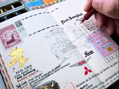 Twenty years after that first Moleskine notebook, Naranja is still hard at work. He now hand-binds his own journals. While Thailand continues to exert a magnetic pull on him, he has also explored Colombia, the Netherlands, Georgia, Germany, Ireland, the Cook Islands, and even Everest Base Camp.