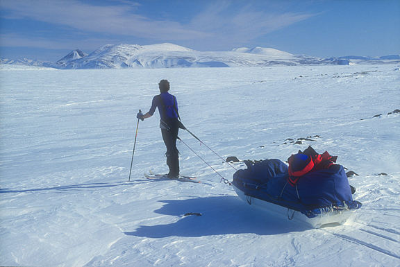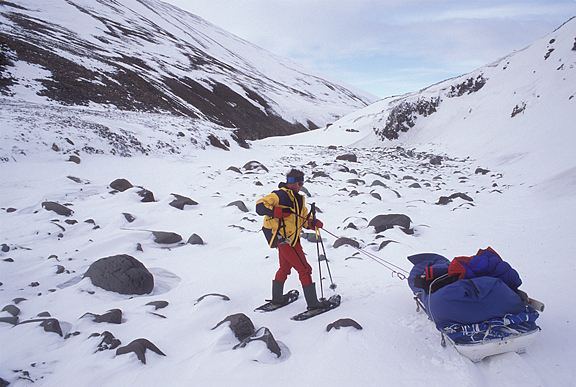 Even if the snow is hard, a sled glides poorly over very cold snow. The colder it is, the more sled hauling feels like dragging a sack of potatoes. If it’s milder than -17˚C or so, you don’t notice the friction much. Photo: Jerry Kobalenko