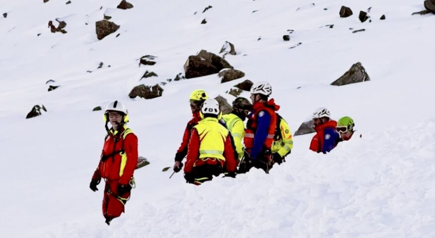 Close shot of the climbers with helmets and hoods on, cloudy background.