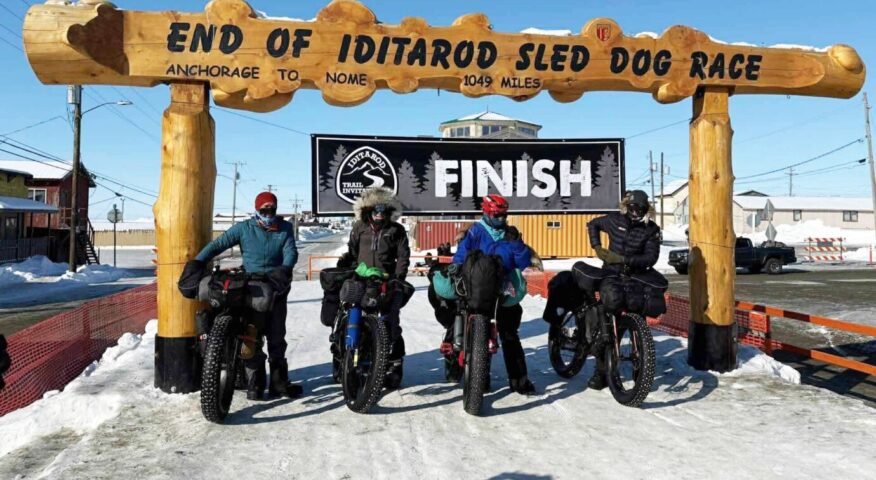 three small figures at the top of a frozen arctic mountain