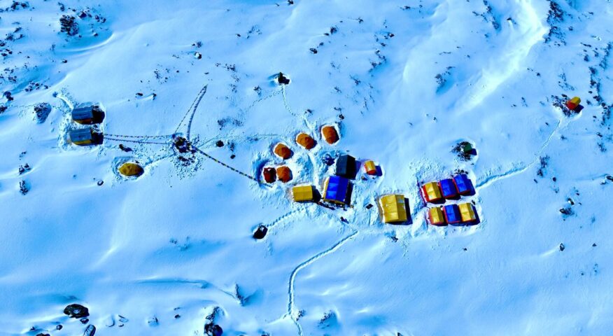 Moro and Txikon by a tent at the base of Manaslu, the summit in background.