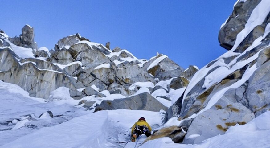 George Band climbing on difficult mixed ground on Kangchenjunga in 1955.