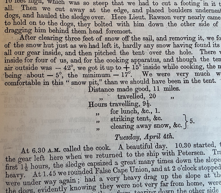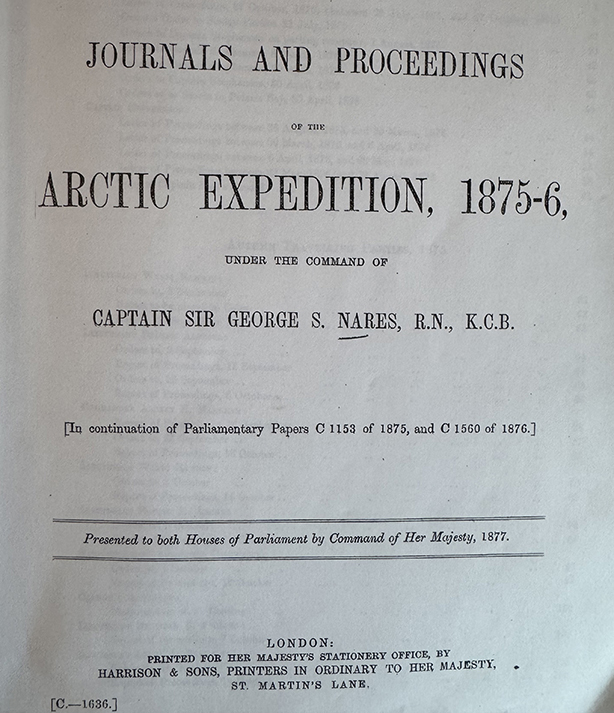 When I travel northeastern Ellesmere Island, even if I’m backpacking, I always carry the five-pound volume of Parliamentary Papers from the British Arctic Expedition under George Nares in 1875-6. Similar to the Greely Congressional Proceedings, its hundreds of pages are full of printed journals and detailed color maps of their routes, showing the locations of depots, camps, cairns, and so on.