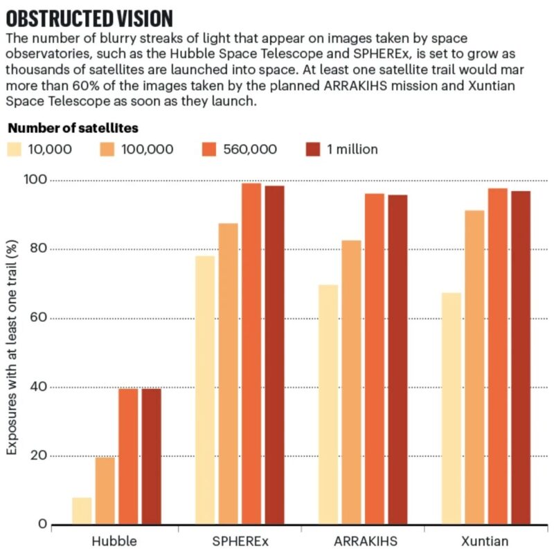 Graph detailing the projected impact of a growing number of satellites. Image: Nature