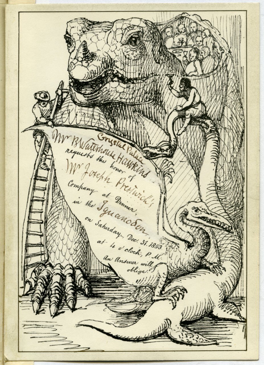 These luminaries received a card, illustrated by Hawkins with prehistoric creatures, inviting them to dinner “in the Iguanodon” on New Year’s Eve. Twenty-one of them turned up, probably not knowing what to expect.