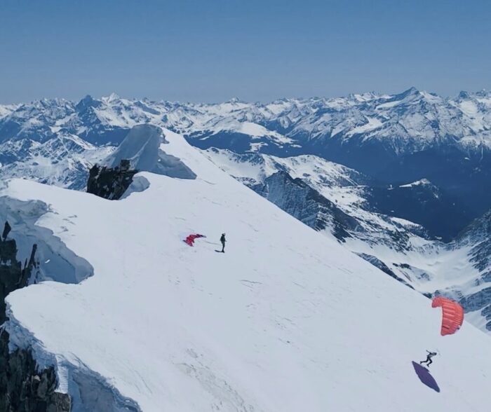 From the Matterhorn, Verdrines skied down to town and cycled to Visp. The same day he cycled into France’s Chamonix Valley. The following day, he climbed the Grandes Jorasses and paraglided back to Chamonix.