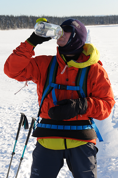 You quickly throw on a warm parka. (I keep mine on top of the sled, under the bungee cords.) Pee, drink. The liquid should be neither too cold nor too hot, so you can glug it down quickly. Occasionally, you have to stuff food into your cheeks and chew it as you begin to manhaul again.