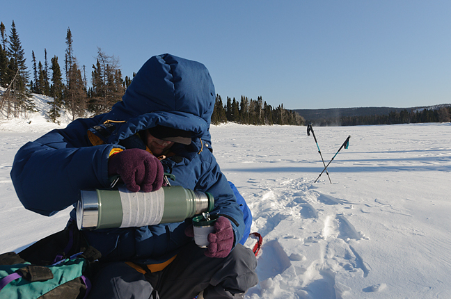You quickly throw on a warm parka. (I keep mine on top of the sled, under the bungee cords.) Pee, drink. The liquid should be neither too cold nor too hot, so you can glug it down quickly. Occasionally, you have to stuff food into your cheeks and chew it as you begin to manhaul again.