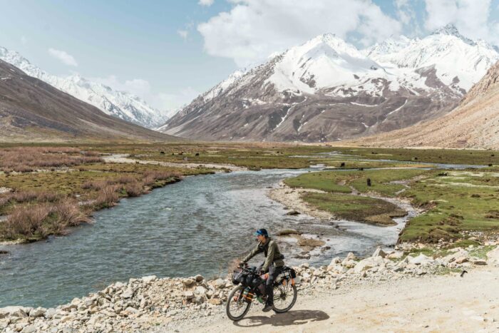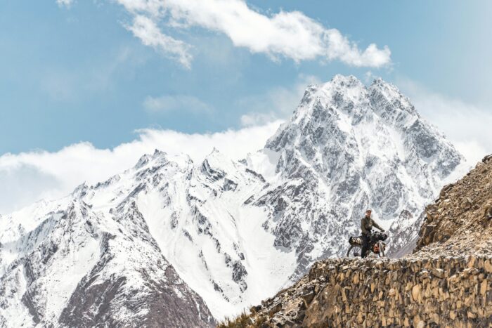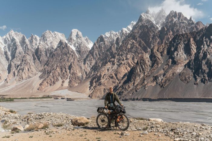 In April 2025, Roving entered Pakistan from China’s Xinjiang province via the Khunjerab Pass, the world’s highest international border at 4,700m. Cycling south through the Hunza Valley, he passed the famous Passu Cones and Lake Attabad, camping beside glaciers and towering 7,000m peaks.